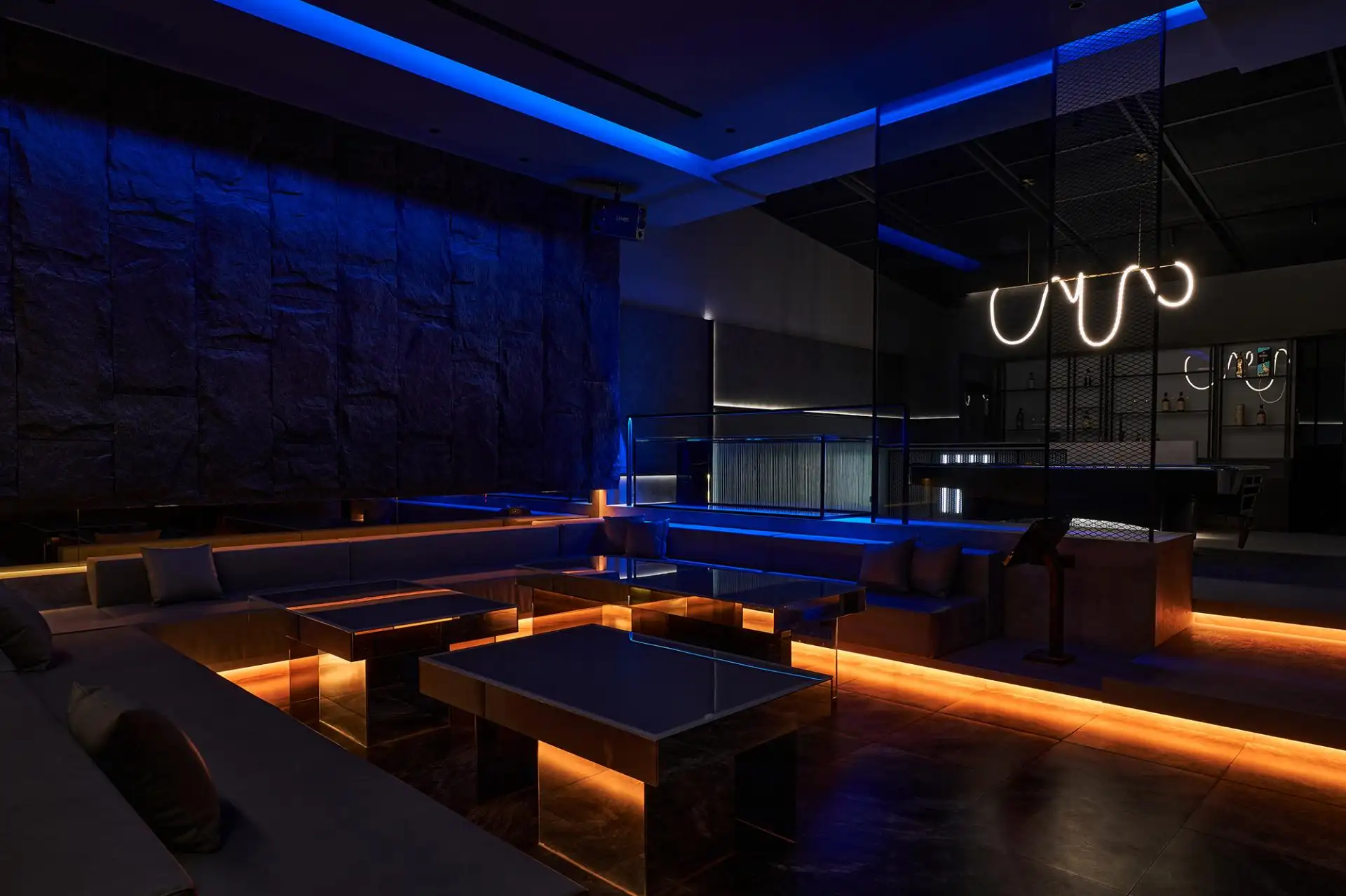 本專案為一座專屬的私人會所,量身打造以呼應屋主熱情好客、溫暖待人的個性,同時兼具個人化的娛樂用途,作為屋主邀請親友聚會的理想場域。整體設計充分體現屋主現代且富有創新精神的美學品味,透過細膩卻具變化的材質層次,營造獨特的空間體驗。設計目標在於展現屋主卓越的品味與真摯的款待之心,讓賓客能於此感受宛如回家的溫馨氛圍。 在入口區域,整體以深色調營造出沉穩而引人注目的氛圍,形成強烈的視覺對比,立即抓住視線。設計同時巧妙地引入戶外景致,採用大面落地窗,使自然光充分灑入室內,光影交錯間形成層次豐富的視覺效果。隨著動線深入,開放式的格局引導人進入一個溫馨且和諧的環境。客廳與品茶區相互串聯,延展出開闊的空間感,同時促進人與人之間的交流互動,營造輕鬆愉悅的聚會氛圍。 進入相鄰的隱密娛樂空間,設計語彙轉為低調而充滿驚喜。設計團隊以鮮明的RGB燈光點綴灰黑色調的基底,使整體呈現出懸浮般的光感效果。空間以現代簡約為主軸,並融入時尚與奢華質感,營造出獨特的沉浸式氛圍。為了在維持主色調一致的同時展現層次感,設計師在岩板、塗料與家具配件上選用不同的質地與紋理,並透過燈光映射呈現多樣的視覺變化。可調式RGB燈光與漸層色彩配置,提供使用者靈活多變的情境選擇,不僅提升互動體驗,更帶來夢幻且富有未來感的空間感受。